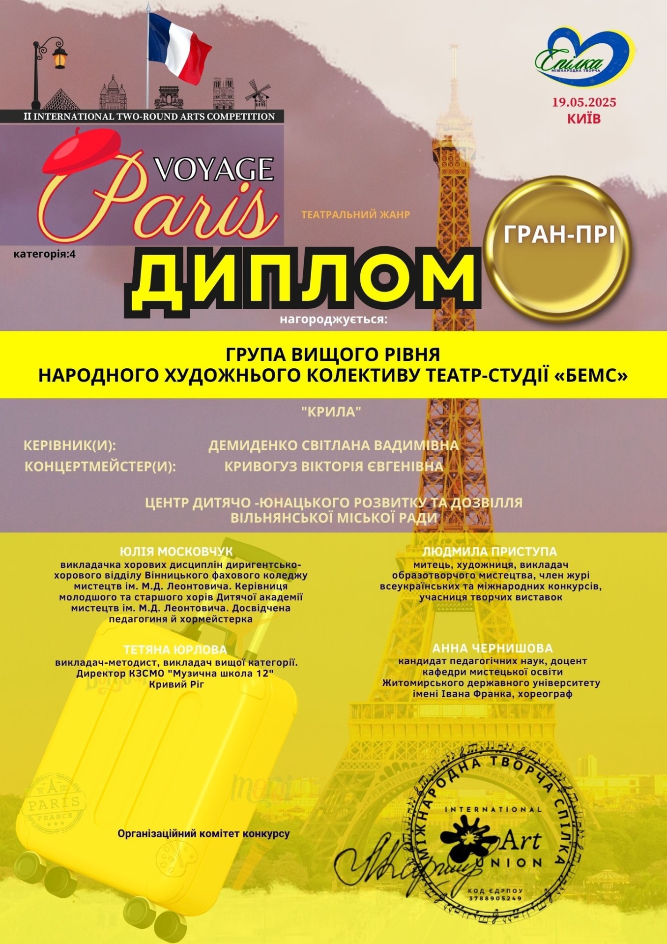 ГРАН- ПРІ на міжнародному фестивалі "PARIS VOYAGE"
