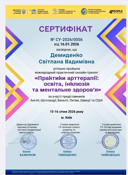 15- 16 січня педагоги ЦДЮРД ВМР ДемиденкоС.В, Кузьменко І.О, Дробоног О.О, підвищили кваліфікацію з практичної арт терапії та інклюзії в освіті.