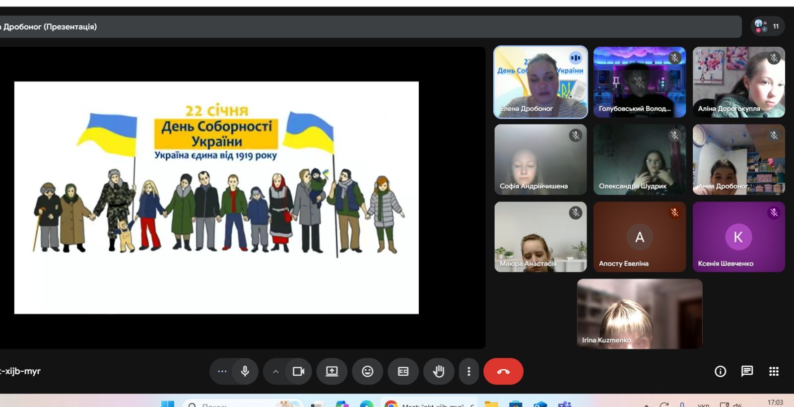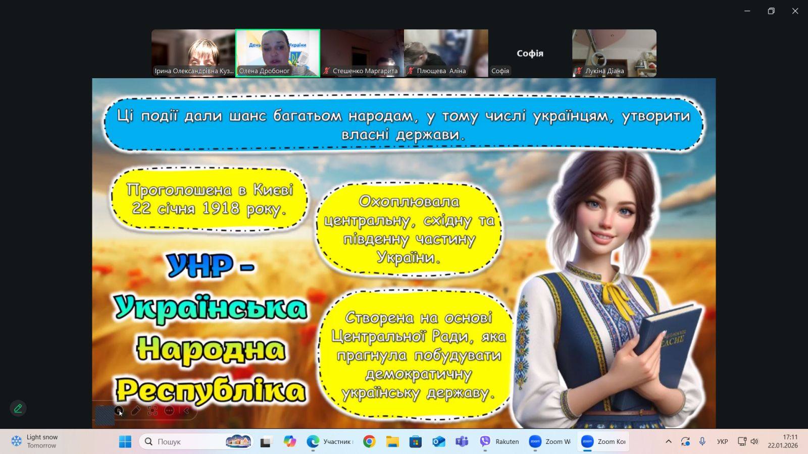 Діти не просто згадували історичні події, більш як сторічної давнини, а й виконували різноманітні тематичні вправи.Вставляли пропущені слова, вишукували літери, вгадували українські міста за символами, розгадували кросворд, розшифровували вислови і слова та з'ясовували "факти" чи "фейки" про Україну.Підвели підсумок,що СОБОРНІСТЬ це найбільша сила...
