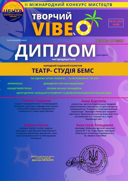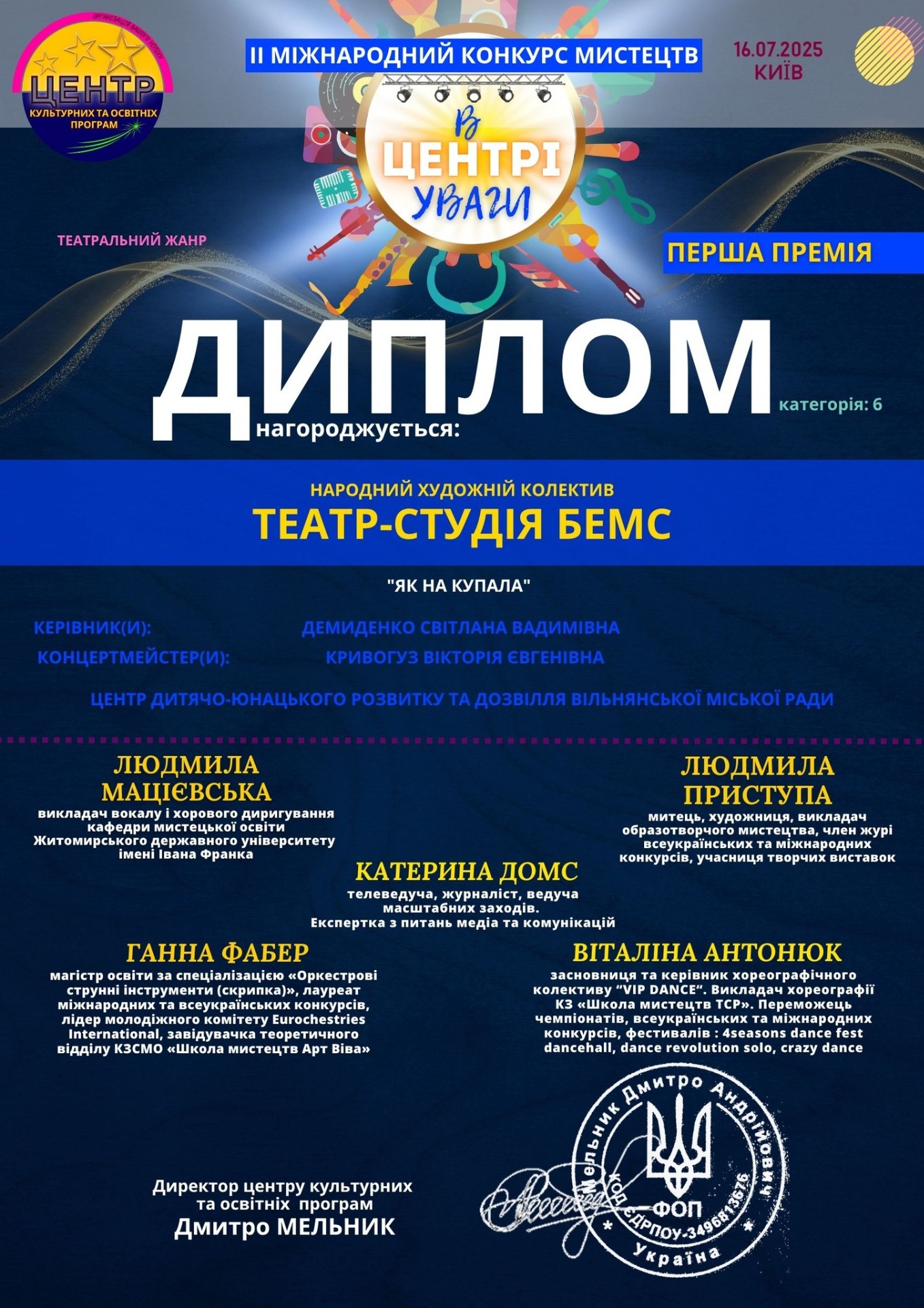 Вітаємо групу вищого рівня Народного художнього колективу театр-студії БЕМС з перемогою, ПЕРША ПРЕМІЯ, на Міжнародному фестивалі " В центрі уваги". Продовжуємо пропагандувати українську культуру.