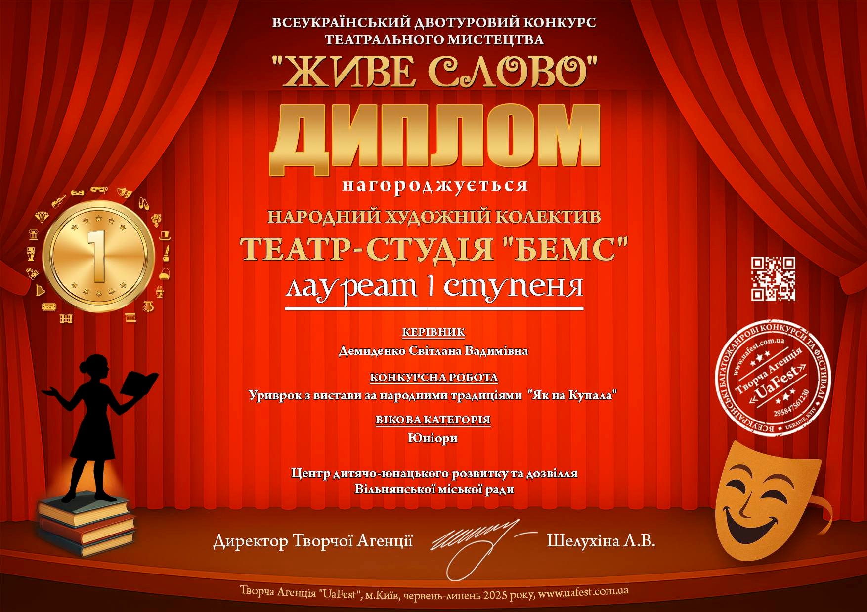 Перемогу ( ПЕРШУ ПРЕМІЮ) у Всеукраїнському професійному конкурсі театрального мистецтва " Живе слово" мають студійці групи вищого рівня БЕМСу В подарунок отримали іменний календар від членів жюрі та приємні враження від високих оцінок роботи акторів з Вільнянська.