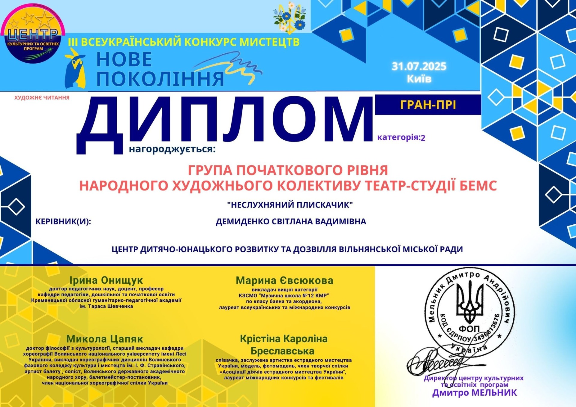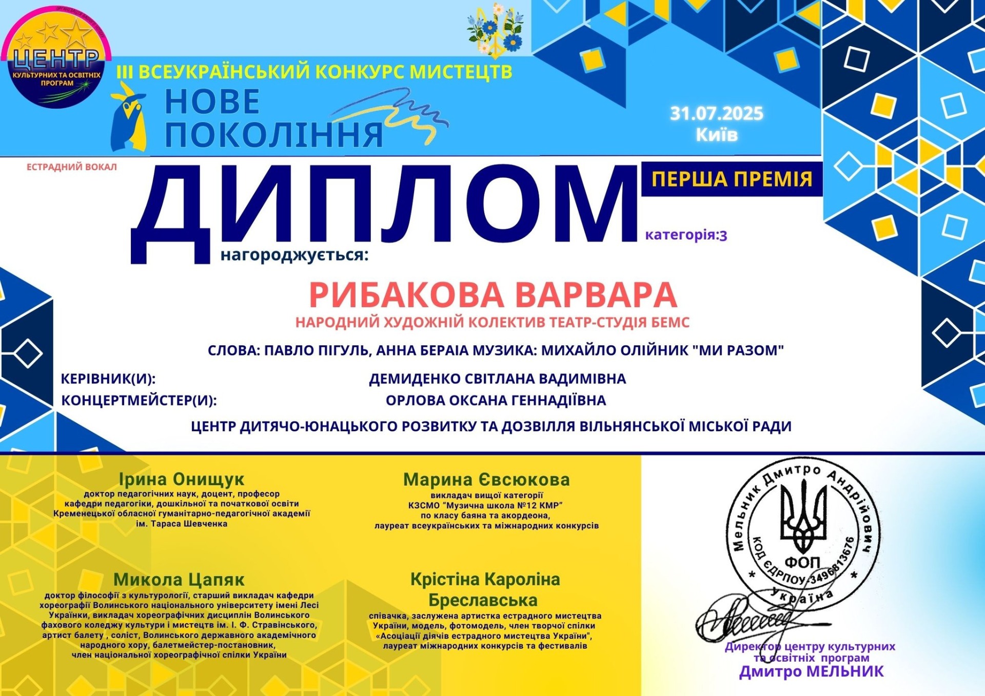 Вітаємо вихованку групи основного рівня Народного художнього колективу театр студії БЕМС Рибакову Варвару з перемогою ,ПЕРША ПРЕМІЯ у Міжнародному конкурсі " Нове покоління'( номінація " вокальне мистецтво Пишаємося Варюшкою, бажаємо нових звершень!